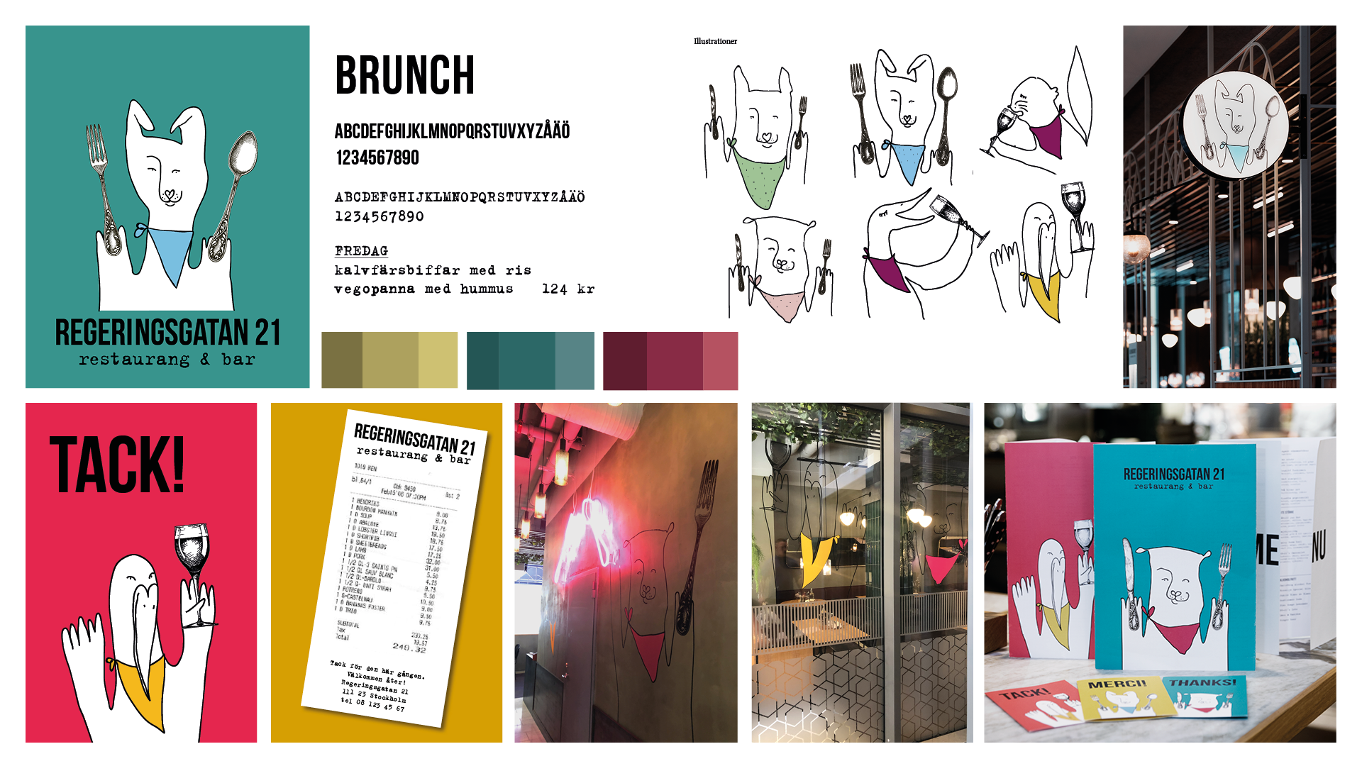Logotyp och grafisk profil för restaurang Regeringsgatan 21. Illustrationer, skyltsystem, väggmålningar och menyer.